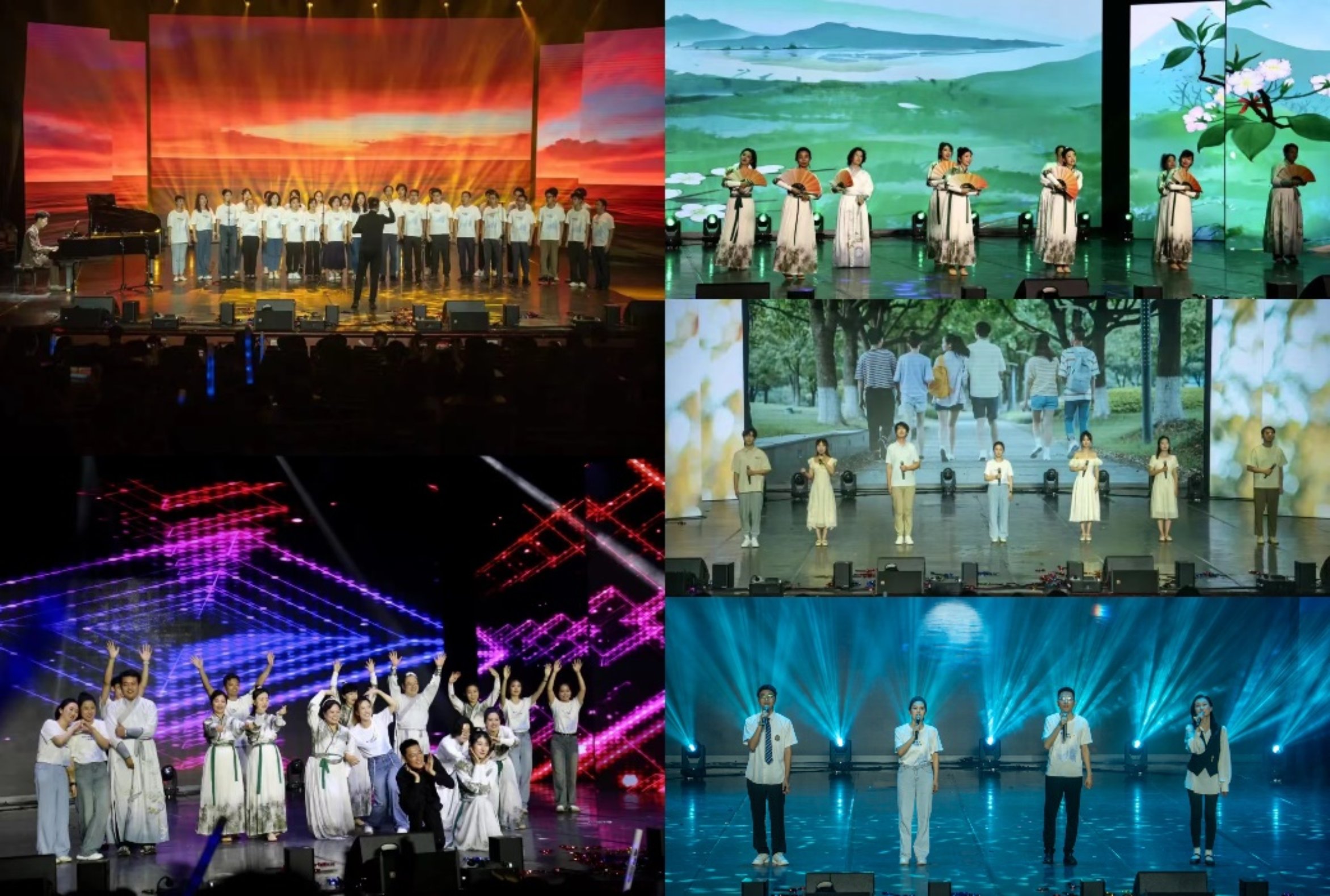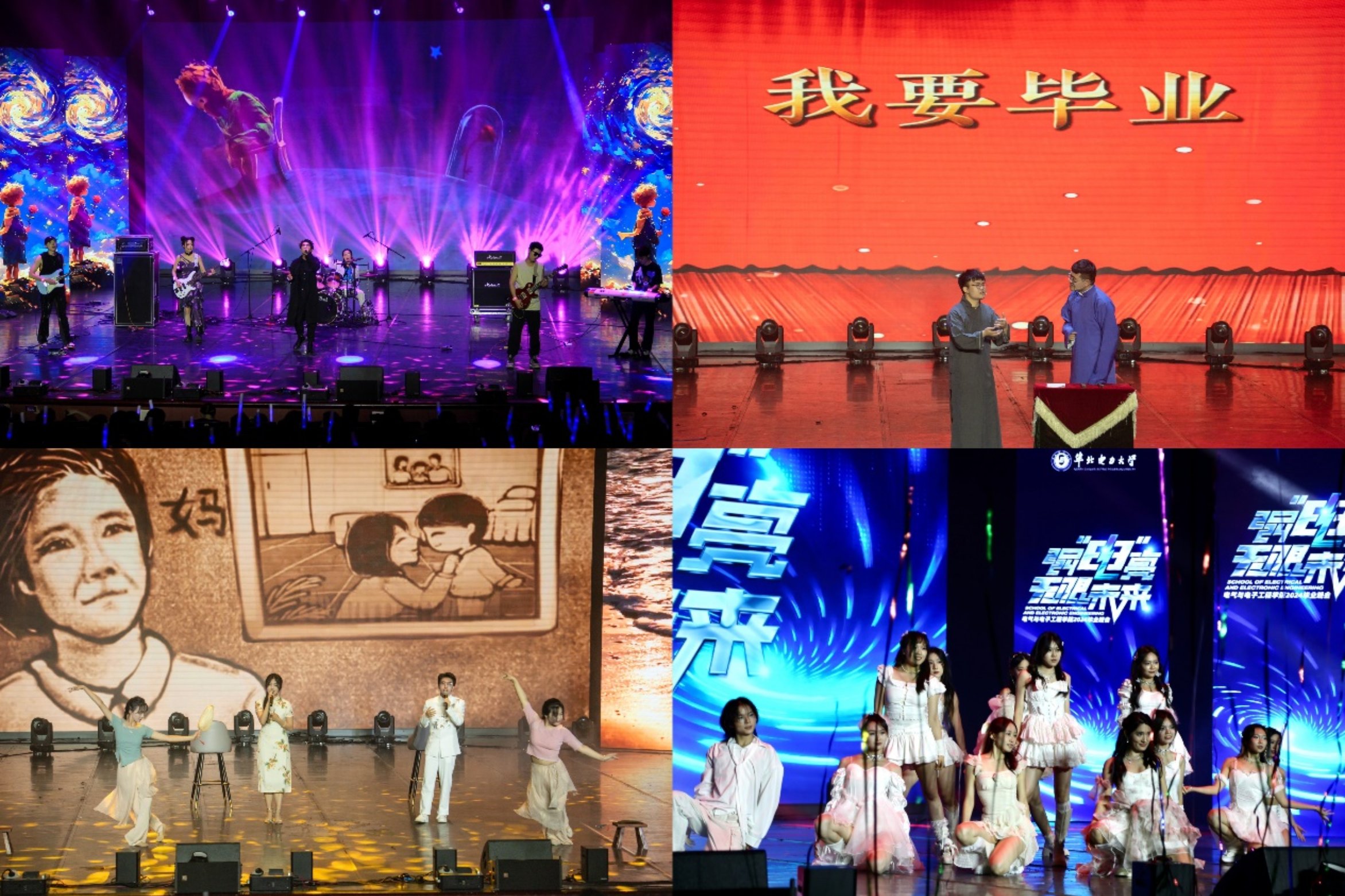 毕业61年的1963届校友金文龙先生向年轻的电院人送来自己的经验分享和毕业祝福;师生联唱表达了将坚强与希冀给未来的自己;民族管弦乐委约创作的《问情》首演,节奏明快,旋律动人心弦;唱跳节目kpop表达了乐此不疲追随日月星辰,终将实现理想;《我爱科研》诙谐幽默的朗诵词,表达了华电科研人们的乐观心态,笑对困难,由大四毕业生带来的双人舞向同学们表达了依依不舍的留恋。