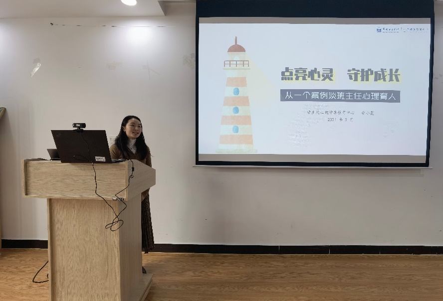 余小霞以一个案例为开始,谈及班主任工作中心理育人的重要性,同时也分享了自己作为班主任的心得体会。余小霞指出季节转换和人的心理状态有着密切的关系,认为人对外在环境的感觉是自己内心的一种投射,两者很容易相互影响,因此希望班主任老师在学生返校后能够和每个学生见见面聊聊天谈谈心,取得信任关系,关注学生面临的困难,及时加以引导,保障班级学生心理和思想整体良好状态。在进行心理引导时,余小霞认为应该从生理、心理、社会三个层面入手,详尽了解学生的信息,采取“多方协同、解决现实问题、家校充分沟通”三方面的措施,对心理困境的同学开展帮扶。最后,余小霞提出了班主任工作中“要温度也要原则、要尽力也要边界、重干预更重预防、爱学生也要爱自己”四点体会,希望与班主任老师一道“点亮学生心灵、守护学生成长”。