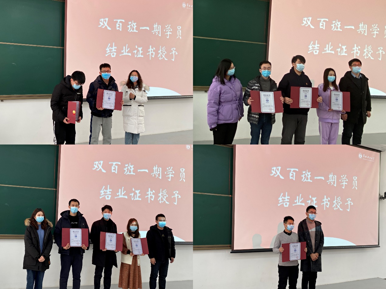 “双百班”三班班主任邓二平对结业的同学表达了祝贺。他表示结业不是终点而是新的起点,在未来的日子里同学们要将在双百班的所学所得化为自己的思考、前行的动力,在新的岗位上努力成长,大力弘扬双百班精神。同时对新加入的同学表示欢迎,希望他们充分展示自己的长处,在团队融合中弥补自己的短处,忘却过去荣誉从零开始,希望每个人都是分子,而不是分母。之后,双百班班主任为第一期结业成员颁发了结业证书,结业成员代表上台领奖并合影留念。