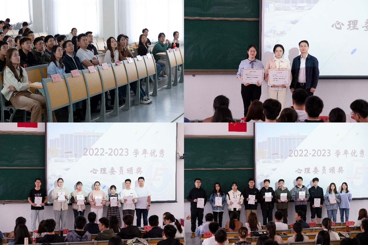 一分耕耘,一分收获。颁奖典礼上,领导老师们为获得2022-2023学年校级优秀心理委员标兵、校级优秀心理委员、院系级优秀心理委员称号的同学颁发荣誉证书并合影留念,同时鼓励受表彰的心理委员们立足新起点,化荣誉为动力,戒骄戒躁,再接再厉。