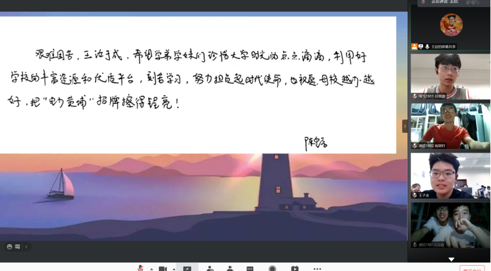 交流之后陈皇言送上寄语,嘱托华电学子担负起时代使命,祝愿母校再谱华章,再创辉煌!会议最后,同学们纷纷打开摄像头和陈皇言云端合影,感谢学姐的到来,与学姐依依话别,会议在温馨而亲切的氛围中结束。会后同学们表示一定珍惜大学时光,踏实求知,知行唯实,成为担得起新时代使命的新青年!