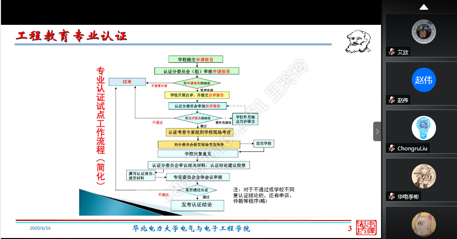 2020年6月16日20点至21点30分3003新葡平台登录入口通过腾讯会议召开了通信工程专业认证启动会,会议由电气学院主管本科教学副院长徐衍会主持。参加本次会议的人员包括,电子系主任戚银城,电子系副主任吕安强,教务处副处长杨世关、梁长屹,通信工程专业负责人赵雄文、孔英会,专业认证资深专家王泽忠、艾欣,以及主管学生工作的副书记、通信信息骨干教师等25人。