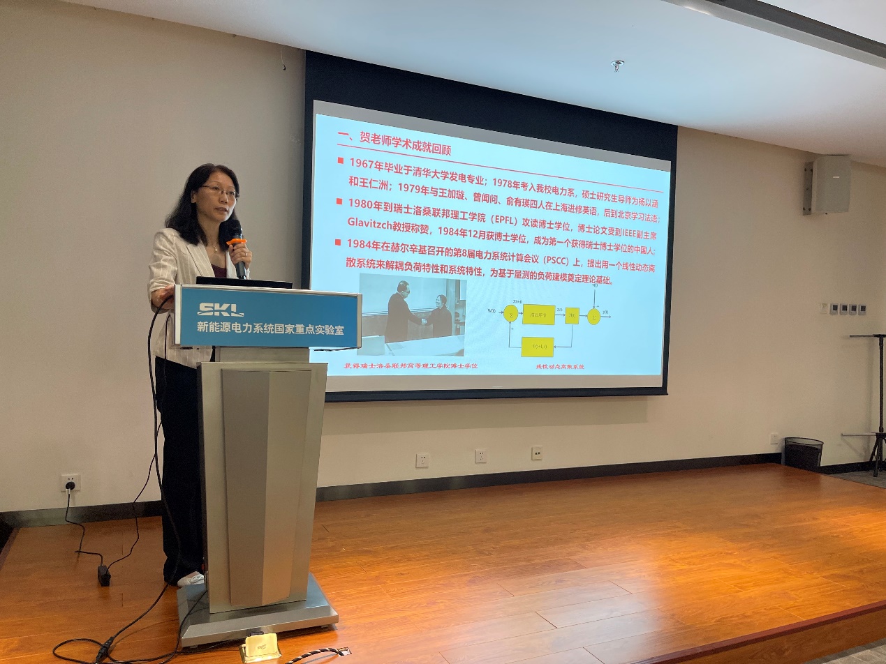 首先,毕天姝副校长作了关于贺仁睦老师荣获2021年“顾毓琇电机工程奖”的主题发言,从贺老师的学术成就、对电气学科发展的贡献、研究生培养情况、对学科发展及人才培养的启示四个方面进行了全面阐述。贺老师在负荷建模领域深耕 30 年,在低频振荡领域具有独到的见解,获得省部级科技奖励 6 项,成为华电有突出贡献的学科带头人和电力系统方向的标志性人物,培养了 29 名博士研究生,114 名硕士研究生,在电力系统规划、设计、运行和研究等领域发挥了非常重要的作用。2002年我校电力系统及其自动化学科被批准为国家级重点学科,学校实现了国家级重点学科零的突破,贺老师作为当时申请国家级重点学科的答辩人,为学科的发展做出了历史性贡献。