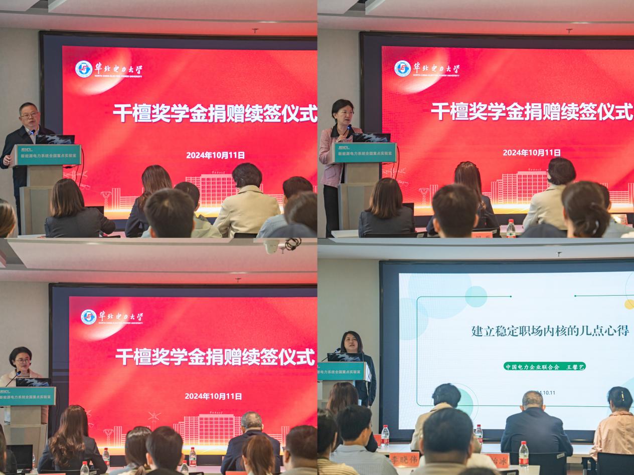 接下来企业特邀嘉宾依次发言。国家发展改革委员会环境保护和资源节约司原副司长赵鹏高表示,实现双碳目标及建设新型电力系统是国家亟需关注的重要课题,希望同学们紧紧抓住电力转型的机遇,提升自身实力,以期在未来生涯中取得更加辉煌的成就。78级校友,国家电网公司原总经理助理,总工程师张丽英分享了自己在基层一线的工作经历,鼓励同学们重视日常积累,打牢专业基础,勇做走在能源电力行业前列的奉献者。87级校友,中国电力科学研究院原首席科学家周泽昕提出了三个关键词—幸运、自信、坚持,勉励同学们在未来的道路上保持初心,迎接挑战,创造属于自己的圆满人生。03级校友,中电联科技开发服务中心绿色科技咨询部副主任王馨艺分享了从学生到职场人的转变经验,她强调了持续学习和有效沟通的重要性,希望同学们在职场中成为值得信赖的人,积极适应变化,勇于直面挫折,以实现自我价值和职业理想。