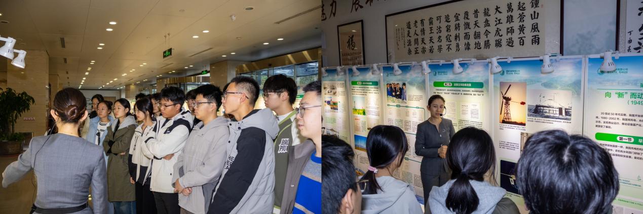讲解员海媛媛带领师生一行做了详细的介绍。此次展览分为上下两篇,分别聚焦以风电、光伏发电为主的新能源发展历程和国家电网公司服务新能源高质量开发利用的举措成效。上篇“‘风光’无限开辟新领域新赛道”通过“向‘新’而动探索与起步(1949—2002年)”“逐‘绿’前行成长与跨越(2003—2012年)”“提‘质’图强变革与引领(2013至今)”三个篇章,以时间为脉络梳理了我国“风光”产业从无到有、由弱到强的发展历程,深刻感受到我国新能源产业在国家政策引领和各方努力下,实现了从跟跑、并跑到领跑的伟大跨越,这一历程不仅是科技进步与国家实力的体现,更是我国在能源领域坚持绿色理念、可持续发展的生动实践。下篇“网擎绿电注入新动能新优势”则聚焦国家电网公司的服务举措与实践成效,从“坚持端稳端牢能源的饭碗”“积极稳妥推进碳达峰碳中和”“努力培育形成新质生产力”“助力共建清洁美丽的世界”四个方面,展现了国家电网公司积极应对能源安全挑战,全力支持新能源大规模开发、高质量发展和高比例接入的坚定决心与有力行动。